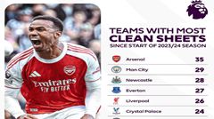 Hàng thủ Arsenal thống trị Ngoại hạng Anh với số trận giữ sạch lưới nhiều nhất